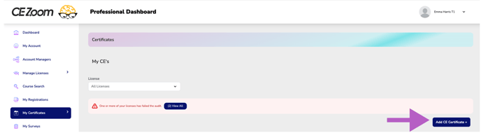 - Choose My CE’s to view your existing CE and click Add CE Certificate to upload a new one.